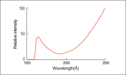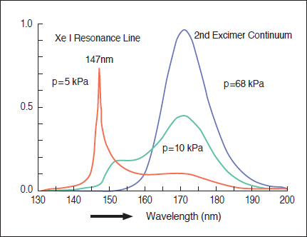 式(1)が示すように、三体衝突によるエキシマの生成は圧力依存性があり、図にみられるように圧力の上昇により放射が増加します。ところで、誘電体バリア放電とは、誘電体を介した電極間へ電圧をかけ絶縁破壊させる放電形式であり、誘電体の表面から高いエネルギーの電子を誘発しガスを励起します。三体衝突の確率を上げるためにガス圧力を上昇させると放電開始電圧が上昇しますので、実用的な封入圧力の限界があり、0.5気圧程度を目処とします。また、誘電体バリア放電は、アーク放電のように時間的に安定した放電維持ができません。よって、与える電圧の周期は数十kHz~数MHzとするのですが、このことでガス温度を上げずに単発的なパルス放電を継続することができるようになります。誘電体バリア放電は、Xe2*のように熱的に不安定であり、かつ発光寿命が短い( ~100ns )発光種の場合はとても都合がよく、電気入力に対する発光効率は 50%にも上ります。Xe2*の発光は、もちろん、アーク放電ランプでも観測されます3)。図5は XeランプのVUVスペクトルを示しており、電子とXeイオンの再結合による放射が短波長側へいくに従ってしだいに弱くなる波長域に大きく突出したスペクトルとして観測され、XeランプはVUV域からNIR域まで幅広いスペクトルを発する光源として使うことができます。