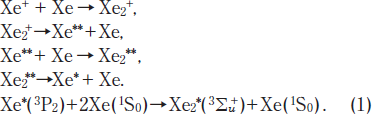 次にエキシマ( Excimer=Excited dimmer )の発光例としてXeについて説明します。図3はXe原子と分子のエネルギー準位図1)、図4は誘電体バリア放電をさせた場合の各圧力に対するスペクトルを示しています2)。Xe分子の基底状態はX1Σg+であり、圧力が数kPaの場合は第一励起準位3P2からの遷移により147nmに共鳴線を放射します。圧力が10kPa程度では共鳴線は放射部を取り囲むXe原子によって吸収されることにより放電容器から出てこなくなります。この現象を自己吸収といいます。一方で、172nmを最大放射波長とするXeエキシマ( Xe2*)の発光は増加しますが、この放射は以下のプロセスにより生じたXe2*( 3Σu+ )の基底準位X1Σg+への輻射遷移によるものです。