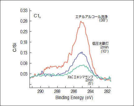 図6は、酸素分子とオゾン分子の光吸収特性を示しています4)。酸素が VUV光の作用により生じる活性酸素O(1D)は、酸化力が強くガラスや金属の有機物による汚れを取り除くことに使われます。VUV光は有機物の結合を解裂させるに足るエネルギーを持っていますので、解裂後の化学種と活性酸素は容易に反応してガス状のCO2や水になりガラス表面から散逸します。これがVUV/O3洗浄です。図7は、液晶ディスプレイ用の基板に使われる無アルカリガラスの表面にエタノールを滴下し押し広げた後、VUV/O3洗浄したときのカーボン濃度を XPSで評価した結果です5)。光洗浄によってカーボンが減少していることがわかります。