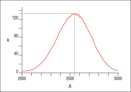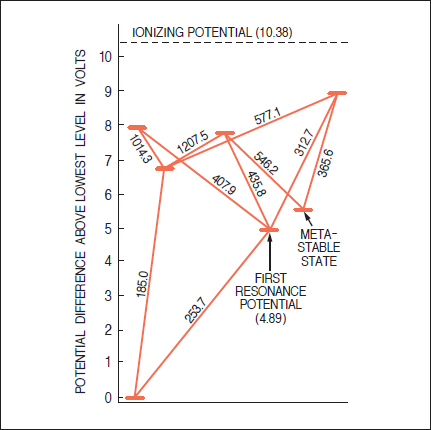 水銀原子からの紫外光で蛍光体を励起させて白色に見える発光をする蛍光ランプは世の中で最も広く使われる紫外光の応用です。図10は、簡略化した水銀原子のエネルギー準位図であり、蛍光体の励起は主に253.7( nm )と記されている共鳴線の照射によって起こります。253.7(nm)共鳴線は、第一共鳴準位である 63P1から基底準位の 61S0への遷移で放射され、逆向きの場合、253.7nm光を吸収します。したがって、前述の自己吸収による放射減衰を避けるために水銀蒸気圧を10Pa以下に抑えた状態とし、放電が維持するように蛍光ランプは設計されています。このような希薄な原子密度であるために電子が放電ガス原子との衝突で授受するエネルギー量が少なく、電子の平均運動エネルギーと気体の平均運動エネルギーとが離れていて、換言すると電子温度が高くガス温度が低いグロー放電プラズマが形成されます。高圧放電プラズマの局所熱平衡( LTE:LocalThermal Equilibrium )モデルとは対称的な非平衡なプラズマ状態です。低圧水銀ランプの全放射のうち、253.7nm線は約80%、185.0 nm線は約30%を占めることが特長です8)。253.7nm線が80%もの割合を占める理由は、1 )放電開始ガスとしてArを数百Paとした場合、プラズマ中の電子が 63P0、3P1、3P2という5eV付近の軌道へ効率的に励起するようなエネルギー分布になっていること、2 )63P0と63P2は63P1に近接する準安定状態にあり電子との衝突で容易に63P1に遷移すること、が挙げられます。253.7nm線を発するランプは殺菌灯との異名もあります。これは生物の遺伝情報を司るDNAの吸収が260nmにあり、この分子結合を切断することで死滅させることに由来しています。