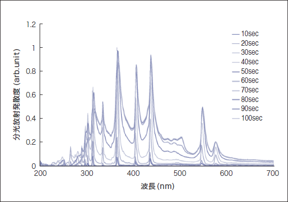 図11. 超高圧水銀ランプのスペクトル 注:点灯開始から10秒間隔でモニター