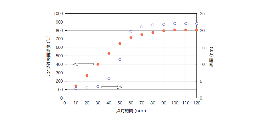 図12. ランプ外表面温度の上昇と併せてプロットした365nm線の線幅の変化