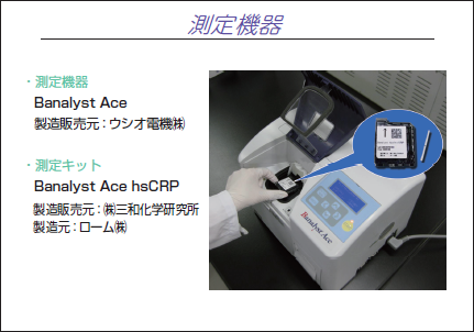 - ・CRPは炎症性疾患、感染症などの経過及び予後のパラメーターとして広く用いられている。また、高感度CPRは動脈硬化のリスクファクターとして血圧・BMI・喫煙等との関連が認められている。