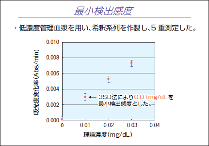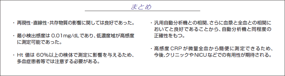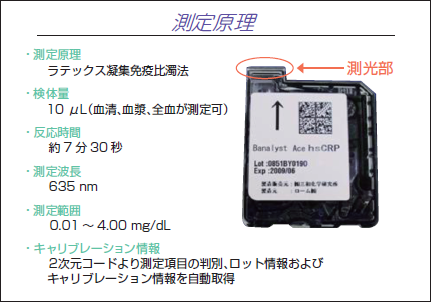 - ・現在、POCTとしてCRPを測定する機器が多数開発されているが、最小検出感度は0.04mg/dL~0.50mg/dLであり、特に全血を検体とする場合は0.2mg/dL~0.8mg/dLと、汎用自動分析機で現在普及している高感度CRPの最小検出感度0.01mg/dLと比較すると劣っていた。