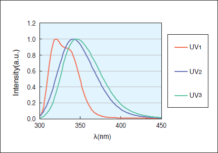 - ② 長時間の信頼性:寿命試験では、以前報告した可視光発光タイプのXEFLと同等のUV照度維持率を示している。