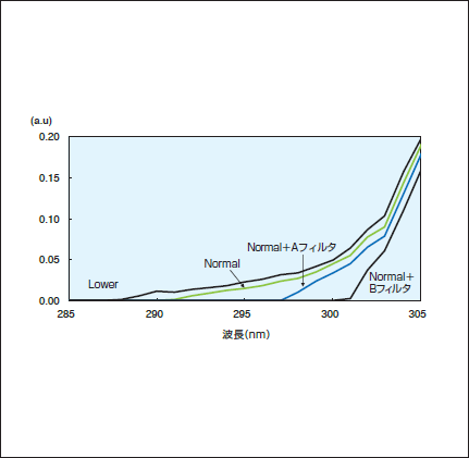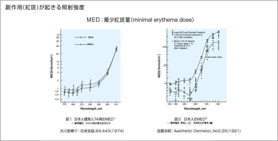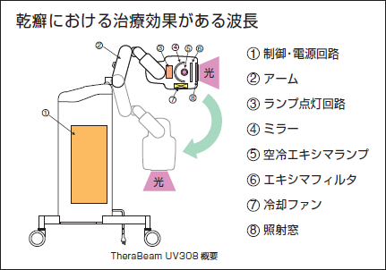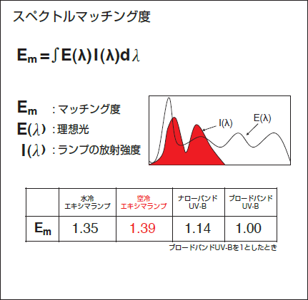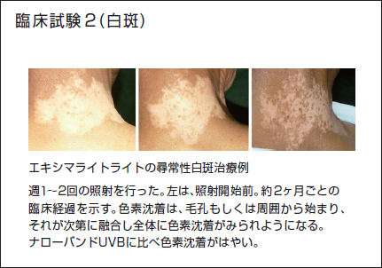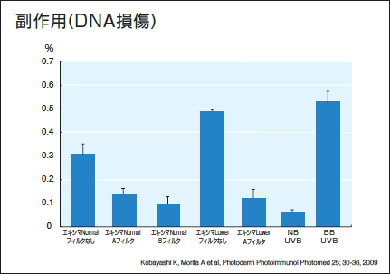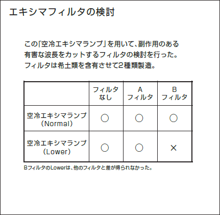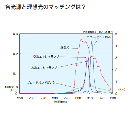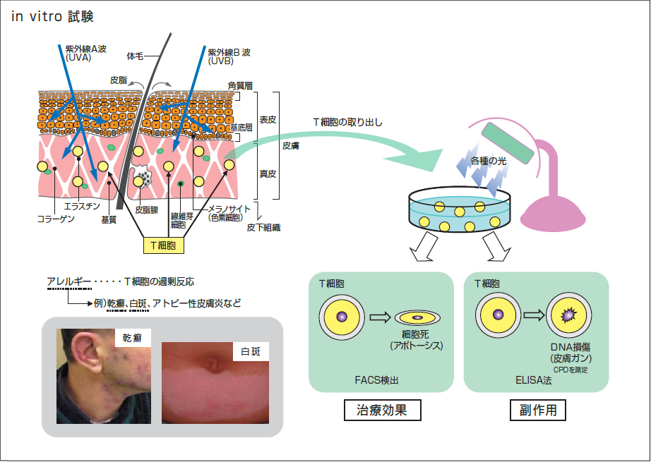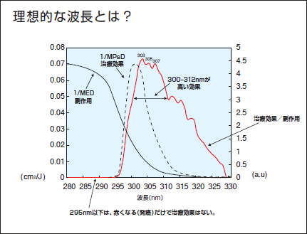 UV光を用いた光線療法は、紫外線によって免疫細胞を抑える治療法であるが、同時に皮膚への紫外線による副作用をどれだけ軽減できるかが重要である。我々はParrishやFisherらの発表した研究結果から、乾癬に治療効果がある(主作用)スペクトルと、日本人の紅斑作用(副作用)スペクトルを数値化し、理想的なスペクトルを求めた。次に理想的なスペクトルにより近い光源を検討し、ナローバンドUV-Bランプ、ブロードバンドUV-Bランプ、水冷エキシマランプ、空冷エキシマランプについて、理想光とのマッチング特性を計算した結果、空冷エキシマランプが最もマッチング率が高いことを示した。次に、この空冷エキシマランプに数種類のするフィルタの検討を行い、最も副作用が少なく、主作用の高いフィルタを開発した。この数種類フィルタを空冷エキシマランプに搭載したものと、ナローバンドUV-Bランプ、ブロードバンドUV-Bランプ、水冷エキシマランプを用いて、主作用効果であるT細胞のアポトーシスと、副作用であるT細胞のピリミジンダイマーの量を測定した。この結果においても、空冷エキシマランプに、このフィルタをつけたものが、副作用が少なく、主作用が高い結果が確認できた。これらの結果から、空冷エキシマランプに主作用が高かったこのフィルタを搭載し、紫外線治療器(セラビームUV308)を作成し薬事認可を取得、乾癬患者、白斑患者に臨床試験を行った結果、高い治療効果が得られた。