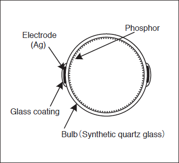 発光管は、合成石英ガラス製で、外表面に細い電極を一対形成している。電極幅は、使用条件により、1~5mm程度に設定している。