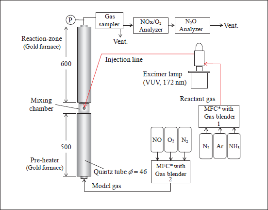 Fig.1に脱硝実験装置の概要を示す。実験装置は、アンモニアガス供給部とエキシマランプ、模擬排ガス供給部、石英製ガス予熱管(500°C一定)、石英製反応管(500℃~850℃)、連続式ガス分析装置から成っている。