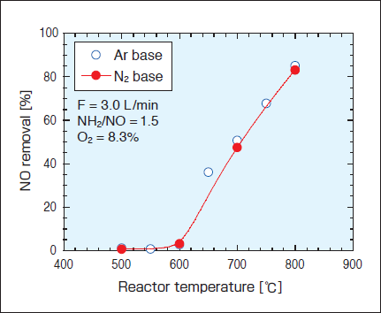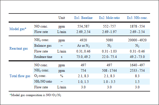 実験条件をTable 1に示す。まず、希釈ガスをAr、酸素濃度およびNH3/NOモル比を一定とした時の反応温度に対する脱硝率の変化を調べた。次に、希釈ガスをArからN2に変え、特性を比較した(Ex.1)。