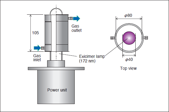 Fig.2にエキシマランプによる真空紫外光(VUV)発生装置の詳細を示す。外径40mm、長さ105mmのXeガス封入誘電体バリア放電方式のエキシマランプ(USHIOInc.製)の周囲に、アルミ製円筒カバー(内径80mm)を配置し、ランプ表面とカバー内面の間をアンモニアガスが流れるようにした。アンモニアガスは、流量0.3L/min程度で円筒流路を下から上に流れ、この間、光が照射される。エキシマランプからは、波長172nmのほぼ単一波長の真空紫外光が26mW/cm2の出力で放射される。