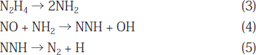 生成したN2H4は、温度場で(3)の反応でNH2ラジカルを生成し、(4)、(5)の反応により低温でも脱硝反応が起こる。