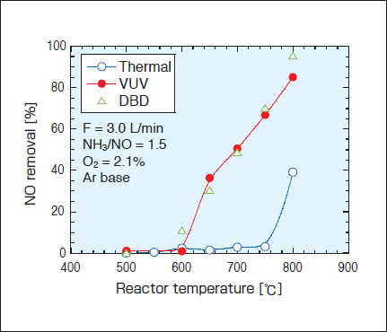 Fig.3に、模擬排ガス流量2.7L/min、NH3/Ar流量0.3L/minとし、NO初期濃度500ppm、O2濃度2.1%、NH3/NOモル比1.5の時の脱硝率の変化を反応温度に対して示した。結果は、VUV脱硝法(VUV)、ラジカルインジェクション法(DBD)、熱的脱硝法(Thermal)、各々について比較した。