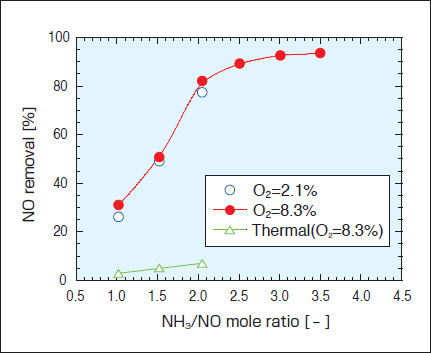 Fig.6に、NH3/NOモル比を1.0-3.5に変化させた時の脱硝率の変化をO2濃度2.1%および8.3%について示した。また、比較として熱的脱硝(Thermal)の結果も示してある。