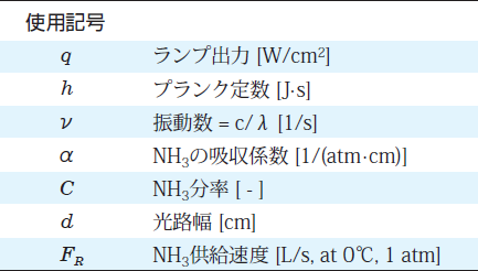 アンモニアに作用する光エネルギー(フォトン)は、アンモニアガスの濃度と滞留時間によって変化するため、Table1に示したように、実験ではこれらの影響も調べた。