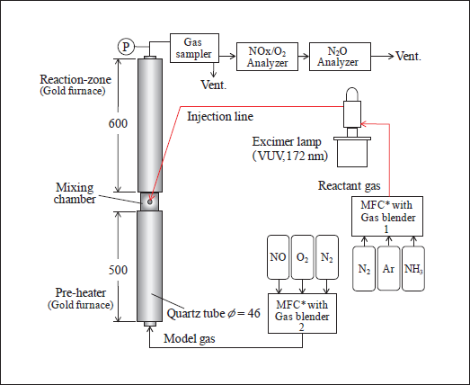 Fig.1に脱硝実験装置の概要を示す。実験装置は、アンモニアガス供給部と真空紫外光発生装置およびモデルガス供給部、石英製モデルガス予熱管(500°C一定)、励起アンモニアガスと模擬排ガスのガス混合室、石英製反応管、連続式ガス分析装置から成っている。