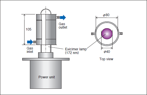 Fig.2に真空紫外光(172nm)発生装置の詳細を示す。外径40mm、長さ105mmのXeガス封入誘 電 体バリア放 電 方式のエキシマランプ(USHIO Ltd.)の周囲に、アルミ製円筒カバー(内径80mm)を配置し、ランプ表面とカバー内面の間をアンモニアガスが流れるようにした。エキシマランプからは、波長172nmのほぼ単一波長の真空紫外光が26mW/cm2の出力で放射される。流量と濃度を調製したアンモニアガスをアルミカバー下方から供給して光励起し、上方出口からPFAパイプ(内径4 mm×長さ1 m)を通じて、ガス混合室に導入した。