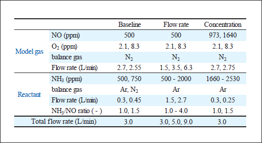 実験条件をTable1 に示す。まず、希釈ガスをArとした時の反応温度に対する脱硝率の変化を、酸素濃度およびNH3/NOモル比を変えて調べた。次に、希釈ガスをArからN2に変え、特性を比較した(Baseline)。また、全ガス流量Fを変えて反応管内ガス滞留時間の影響を調べるとともに(Flow rate)、真空紫外光がアンモニアに作用するフォトン数の影響も調べた(Concentration)。