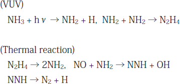 NH3ガスの吸収係数は、波長172nmでは59atm-1cm-1であり、この光によりNH3分子は励起され、NHやNH2といったラジカルを光生成すると考えられる。本実験では、VUV装置出口からガス混合室までをパイプで連結しているため、このようなNHiラジカルが残留しているとは考えにくい。しかしながら、NH2ラジカル同士は室温で反応し、HNNH、NH2NH、N2H4のような準安定種を生成する。これらが温度場でNHiラジカルを容易に生成することで、Thermalよりも低温で脱硝反応が起こったものと考えられる。