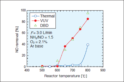 Fig.3に総流量3.0L/min、O2濃度2.1%、NH3/NOモル比1.5、NH3希釈ガスArの時の反応管温度(管外壁の温度)に対する脱硝率の変化をVUV励起アンモニア脱硝法(VUV)、ラジカルインジェクション法(DBD)、選択的無触媒脱硝法(Thermal)、各々について示す。ここで、NO初期濃度500ppmである。