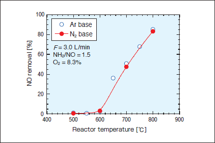 モデルガスの予熱および反応温度の制御は、ゴールドファーネスを用いて迅速な昇温を可能とした。モデルガスおよびアンモニアガスは、混合器付マスフローコントローラー(KOFLOC Model 8500)で流量制御した。反応管出口圧が300-500Paとなるように、ガスサンプラー(SHIMAZU CFP8000)の流量を調節した。ガス分析は、赤外線式NOx計(HORIBA VIA510)、限界電流式ジルコニア法O2分析計(SHIMAZU NOA-7000)、赤外線式N2O計(HORIBAVIA510)を用いて、脱硝前後の濃度変化を連続で分析した。