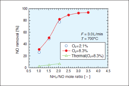 Fig.5に、NH3/NOモル比を1.0-3.5に変化させた時の脱硝率の変化をO2濃度2.1%および8.3%について示した。比較としてThermalの結果も示してある。モル比を増加させると脱硝率は大きく変化し、モル比2.1では700°Cで脱硝率80%を越えることがわかった。また、酸素濃度2.1%よりも8.3%の方が若干(5%程度)脱硝率が高くなった。
