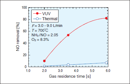 VUV励起アンモニア脱硝法の結果は、選択的無触媒脱硝法(Thermal de-NOx)およびラジカルインジェクション脱硝法と比較した。