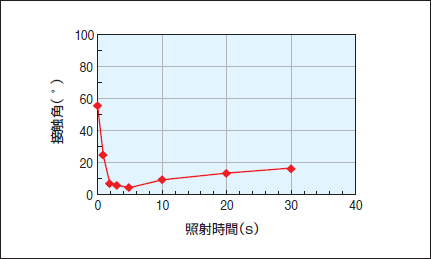 洗浄効果の評価の簡易手法として、純水の接触角が用いられている。LCD製造に使用される基板(無アルカリガラス)の洗浄効果を表したグラフを示す(図3)。LCD 製造では、基板洗浄の目標値として、純水接触角が10°以下というのが一般的である。現在、標準的に採用されている高出力タイプのランプでは、照射時間5秒以下で純水接触角10°以下を実現できる。