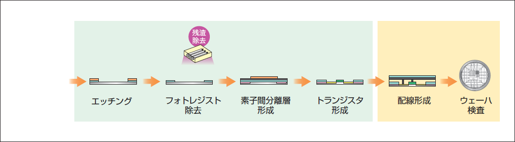 半導体製造(前工程)での導入事例を図4に示す。ウェーハ投入後、成膜・露光の前後に用いられている。また、デバイスの微細化、高性能化に伴い新たなプロセスが検討されており、線スペクトルに近い単一波長を待つエキシマ光は、Xe エキシマ光(172nm)だけでなく、XeClエキシマ光(308nm)、KrClエキシマ光(222nm)、ArF エキシマ光(193nm)などの用途も拡大している。