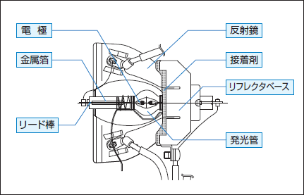 プロジェクター用超高圧水銀ランプは通常、発光管と反射鏡がセットで固着されている。ランプの発光管は石英ガラスから成形され、発光管内部の一対の電極はタングステンから作られる。電極の後端部には薄い金属箔を溶接し、その箔のもう一端部にはリード棒を溶接する。発光管は無機系の接着剤を用いて反射鏡の所定の位置に固定される(図1)。