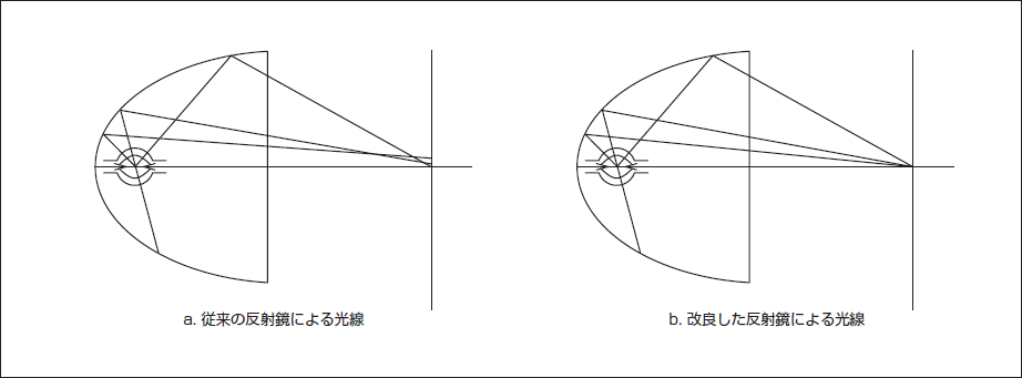 光利用効率についてはチップサイズに合わせた短アークランプの開発が第一であるが、それ以外にも光学系の特徴に合わせ、発光管形状や反射面を最適化するものも開発されている(図2)。また、さらに明るさを稼ぎたい場合には複数ランプの組合せで使用される場合があり、光学系の工夫により光利用効率を高める取組みもなされている。昨今の光学シミュレーション技術の進歩は著しく、今後も更なる光利用効率の向上が期待される。