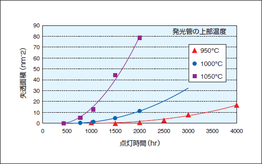 黒化や失透防止の次なるポイントとしてはランプ動作時の冷却管理が非常に重要である。黒化の防止にはハロゲンサイクルを利用していることは述べたが、発光管全体の適切な温度管理をしないと相対的に温度が低い発光管端部に黒化が付着することとなる。また、失透については発光管上部温度を下げることでガラスの失透を抑制し寿命が著しく改善されることが実験的に確認されている(図3)。
