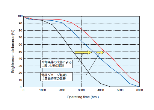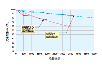 これら冷却条件の最適化に加え、電力に応じた適切なサイズの電極設計や上述のようにランプの駆動方式の改善によって電極損耗を抑え、光利用効率を維持することで照度維持率は各段に向上した(図4)。今後も更なる長寿命化にむけて改良が継続される。