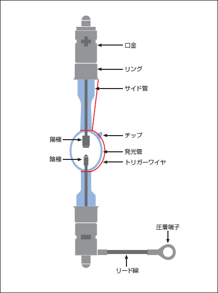 - ⑥ランプ内に封入されるキセノンガス圧が高い(非点灯時でも数気圧から十数気圧)為に、ランプの始動には30~40kVの高電圧パルスが必要となる。