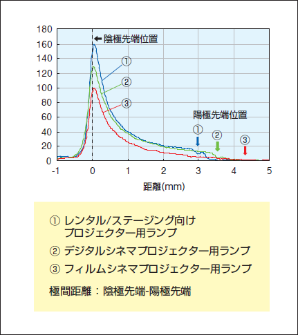 反射型液晶やDMDといったデバイスを用いたいわゆるデジタルプロジェクターにおいては、そのデバイスの小ささや複雑な光学系構成のために従来型(フィルム映写機用)のキセノンランプではアーク輝度が足りずに十分なスクリーン輝度を得ることができない。そこで、これらのプロジェクター用には特別に高輝度化設計が行なわれたランプが設計された。一例として各用途向け2kWランプの軸方向アーク輝度分布の比較を図6に示す。デジタルシネマプロジェクター用ランプでは、ほぼ同じ電力仕様のフィルムプロジェクター用ランプに比べて極間距離で0.84倍、輝度で1.3倍の設計がなされている。また、映画のように暗所で常設されるとは限らないレンタル/ステージング向けプロジェクター用ランプでは更なる高輝度設計が必要となり、極間距離で0.7倍、輝度は1.6倍となるよう設計されている。