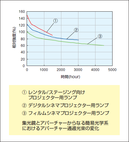キセノンランプの設計において、このような高輝度設計とするためには短極間化と同時に高ガス圧化、更に電極先端形状の最適化を行う必要がある。つまりは従来ランプと同等の電力をより狭い空間に集中させることに相当し、これは電極(陽・陰極共に)への負荷が大きくなって電極損耗スピードが増大することを意味する。これに対してランプメーカー各社は負荷耐性の高い素材の採用や、さまざまな設計工夫による負荷の低減を試みているが、残念ながら現状において全ての高輝度型ランプが従来型ランプと同程度の寿命を得ているとは言えない(図7)。今後、長寿命ランプの開発が待たれるとともに、必要とするスクリーン輝度と寿命のバランスを総合的に判断したランプ設計が必要である。