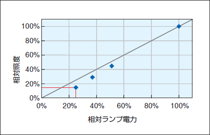 超高圧水銀ランプでは省エネや画像コントラストの改善のために電力可変(調光)範囲の拡大が検討されている。電力を絞ると明るさは略比例で変化する(図8)が、単純に電力を絞るとフリッカ(アーク不安定)が発生したり、水銀の動作圧変化で色味が変化したりするため駆動方式や冷却条件の工夫が必要となってくる。電力調光とパネル調光を組み合わせた新たなシステムも提案されている7)。