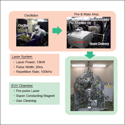 図2に現在、開発に用いている実験光源(ETS 装置;CO2レーザとEUV発光チャンバからなる)、表2にETS装置を用いた開発状況をまとめた。発光点出力から求めたIF点出力(Raw)は、25W(2009年EUVLシンポジウム,プラハ)から、69W(2010年SPIE、サンノゼ)、そして104W(2010年4月プレス発表、10月EUVLシンポジウム、神戸)と向上している(Duty cycle 20%)。5)この出力向上は、主にCO2レーザの出力向上(5kWから7.9kW)、プレパルスプロセス採用によるCEの向上(1.5%から2.5%)による。