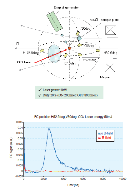 図3に磁場印加によるSnイオンの除去効果を示す。超伝導磁場の磁力線方向に垂直な位置に置かれたファラディカップ(位置;H方向52.5度、V方向30度)により、Snイオンを観測したところ、磁場無しの場合に観測されたSnイオンが磁場印加により全く検出されないことがわかる。プラズマから発生するデブリとしては、Snイオン以外に中性Sn粒子が考えられるが、この中性粒子に起因するSn膜堆積に対しては、必要最小質量のSnドロプレットの採用により、出来るだけ発生するデブリを減らすとともに、堆積したSn膜をIn-situでガス・クリーニングする方針である。既に、充分なSn堆積膜のエッチング速度が得られており、このクリーニング機構を実際のEUV発光チャンバに組み込む検討が進められている。
