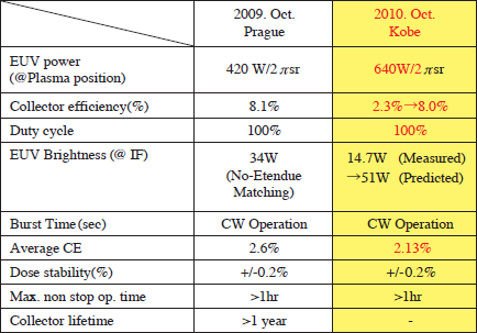 LA-DPP光源は、ASML社製ADT(α-Demo-Tool)露光装置に搭載されており、低出力(5~8W@IF)ではあるが、実際のプロセス開発、デバイス試作に使用されている。また、図4に示すβ光源が昨年のEUVLシンポジウムで報告された(発光点出力420W/2π・sr)。7)このβ光源を使って、発光点出力640W/2π・sr、CE 2.13%、Duty cycle 100%(連続発光)で、IF点出力14.7W@IF(Exposure)を実測したことを、今回のEUVLシンポジウムで発表した。8)今後、斜入射コレクタなどの改善が進み、集光率の向上が図れれば51W@IF(Exposure)が見込めるとしている。またデブリ対策としてDMT(DebrisMitigation Tool)とバッファガスを用いることによってコレクタ寿命>1年と見積もられている。現在、更なる高出力化に向けて、①回転電極への均一Sn薄膜塗布、②Sn熱浴の恒温制御、③トリガーレーザ最適化、④コレクタ捕集効率向上および⑤デブリ対策、を検討中である。高出力化は、パルス強度はあまり強くせず、主に繰り返し周波数を増大(~30kHz)させることによって進める方針である。また、トリガーレーザの工夫により、ピンチ放電プラズマを微小で高密度にでき、これによりCEの向上と高速Snイオンの発生を減少すると共に、CEの向上を図ることができる(汚染、およびコレクタ表面のスパッタの低減)。表3にLA-DPPの稼動試験の結果をまとめた。