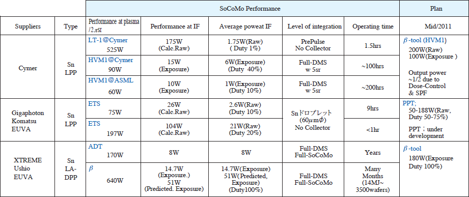 表4. EUV光源のベンチマーキング(EUVシンポジウム、2010年10月神戸)