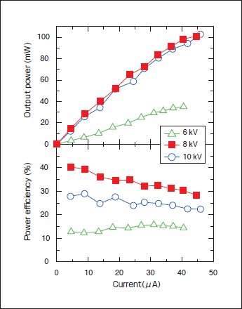 次に、加速電圧VAを6、8、10kVとしたときの深紫外出力を測定した。図に出力電圧の照射電流依存性を示す。照射電流の増加とともに、深紫外出力も増加し、VA=8、10kV、照射電流45µAのときに100mWの深紫外出力を達成した。また、パワー効率に関しては、VA=8kVのとき最大となり、とくに照射電流5µAのときに40%を越す値が得られた。これらの実験結果はモンテカルロシミュレーションの結果とほぼ一致し、妥当であるといえる。詳細は、当日に報告する。