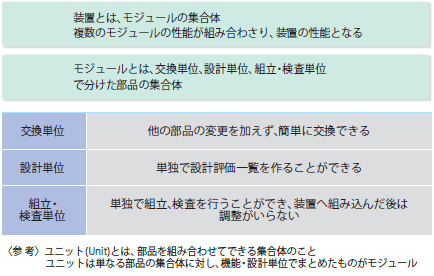 モジュールとは、交換単位、設計単位、組立・検査単位で分けた部品の集合体であり、装置は複数のモジュールで構成される。ここで注意しなければいけないのは、ユニットとの違いである。ユニットとは、単に部品を組み合わせてできる集合体である。これに対し、機能・設計単位でまとめたものがモジュールである。