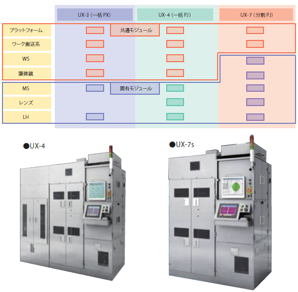 プロキシミティ露光装置(UX-3シリーズ)、一括投影露光装置(UX-4シリーズ)、分割投影露光装置(UX-7 シリーズ)と、異なるタイプの露光装置でプラットフォーム、搬送系を共通モジュール化している。また、アライメントを行うワークステージ(WS)、アライメントマーク観察のための顕微鏡(カメラ)駆動部は、プロキシミティ露光装置、一括投影露光装置で共通モジュール化を行っている。