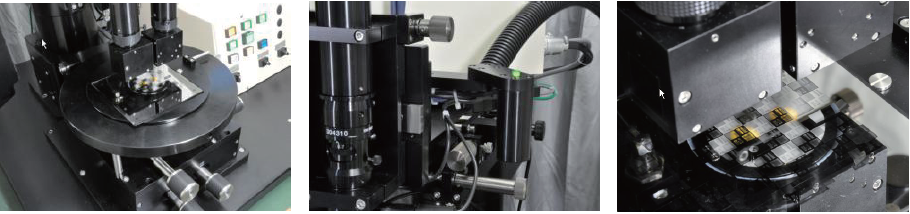 従来のウェーハ搬送方式で用いられる多間接ロボットに代えて、独自に開発した搬送ロボット3台を搭載、処理能力190枚/hrs.という高スループットを実現した。また、新開発のアライメント画像処理には、任意座標指定のサーチおよびインテリジェントθサーチを複合して行うオートアライメントを採用した。さらに、安定した視認性を実現するため、顕微鏡のハロゲン照明についても、画像処理によって照度減衰のフィードバックを行う新機構を搭載している。