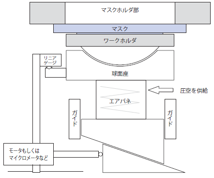 - ①フォトマスクとウェーハの平行出しは、ウェーハテーブルを空気の層で浮遊させ、アライメント機構部に内蔵されたエアバネでフォトマスクに正確にコンタクトする方式を採用している。
