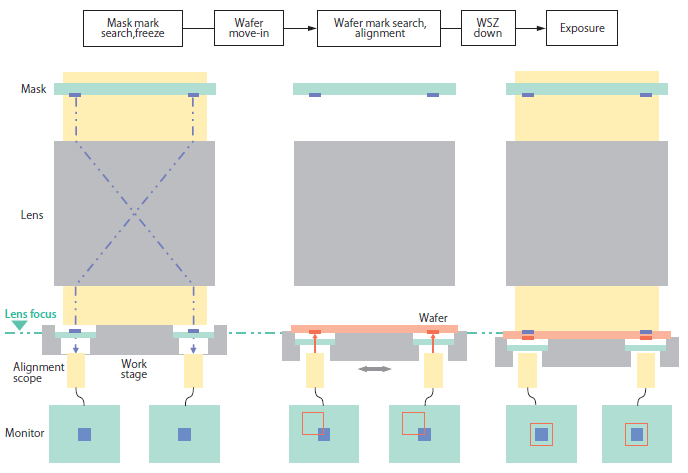 4インチのガラスマスクを使用し、オペレータがフォトマスクとウェーハのアライメントマークを顕微鏡で撮像し、モニタに映し出された画像を見ながら位置合わせを行う。露光ギャップを設定し、露光スイッチを押すと自動で顕微鏡が退避、ランプハウスが所定の位置に移動し、設定光量露光を行ったのち、自動退避をする。