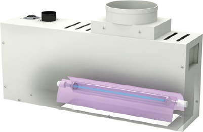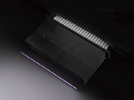 「ユニキュア」は、線光源を使用した装置であり(図3参照)、「スポットキュア」と比較して大きい面積を照射することができる。ランプを内蔵した灯具をはじめ、冷却用ブロア、電源をセットで販売しており、ランプはメタルハライドランプと高圧UVランプの2種類がある。上述したスマートフォン用では、主にメタルハライドランプが使用されている。