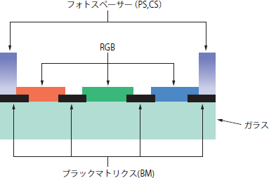 上記カラーフィルター部の基本構造は、セルを区切るブラックマトリクス(BM)とセル内部のRGB部、2枚のガラス基板間に液晶を注入する均一なスペースを作るためのフォトスペーサー(PS)、カラムスペーサー(CS)と呼ばれる柱形状(カラム)を形成したスペーサーからなる(図1)。