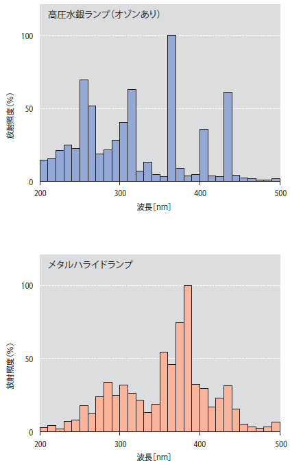 図1. 高圧水銀ランプとメタルハライドランプの分光スペクトル図