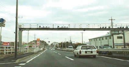一般的にNシステムと呼ばれ、当初は交通渋滞情を得るため、主要幹線道路を中心に設置されたものである。車輌ナンバー機を1km程度の間隔で設置し、各車輌の通行時間を測定している。データの管理は警察が行い、現在は犯罪車輌の通行監視などにもデータが利用されていると噂されている。設置場所は写真4のように道路上方で、路側からの照射撮影に比べて太陽やヘッドライトの影響が少なく、安定した映像が得られやすい。照射範囲は、距離:15~20m、幅:3.5~4.0m、高さ:約1mの仕様になっている。ETCゲート監視とは異なり、撮影した映像からナンバーを読み取ることが必須で、ここに赤外線のエネルギーを集中させるため、高さ方向は限定されている。但し、車速が早いので、シャッタースピードは1/1000、1/2000となる。